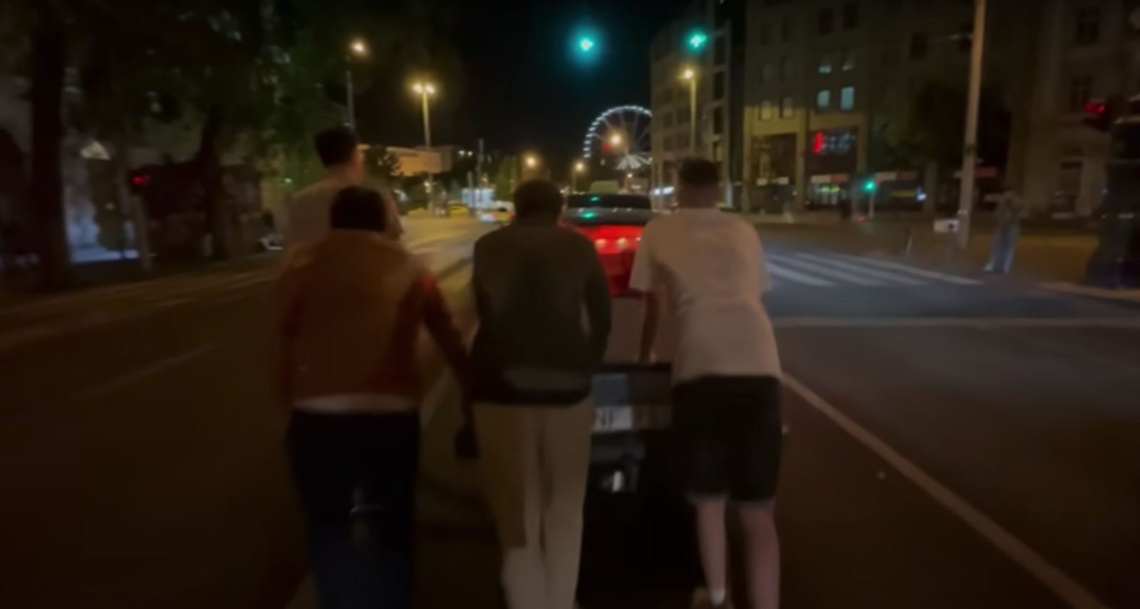 Ezt az őrült tempót és a kilométereket a fiúk is nehezen, az autó pedig egyáltalán nem bírta és 5 percre Balázsék üzletétől az Andrássy út közepén feladta, úgyhogy a srácoknak az éjszaka közepén dönteniük kellett, vagy ők lesznek a másnap reggeli útinform vezető híre, miszerint óriásdugó az Andrássy úton vagy kipattannak a kocsiból és betolják az autót az üzlethez, cirka 1 km… A második opciót választották.