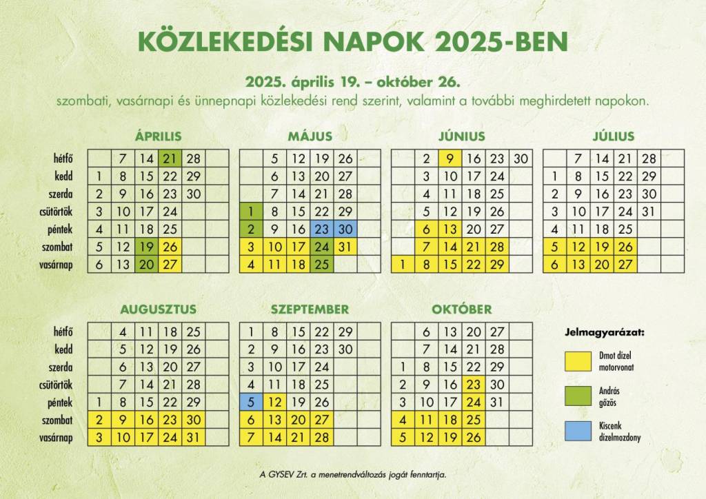 A GYSEV Zrt. a változtatás jogát fenntartja. Tűzgyújtási tilalom ideje alatt a gőzmozdonyos közlekedés szünetel, helyette dízelmozdony üzemel.