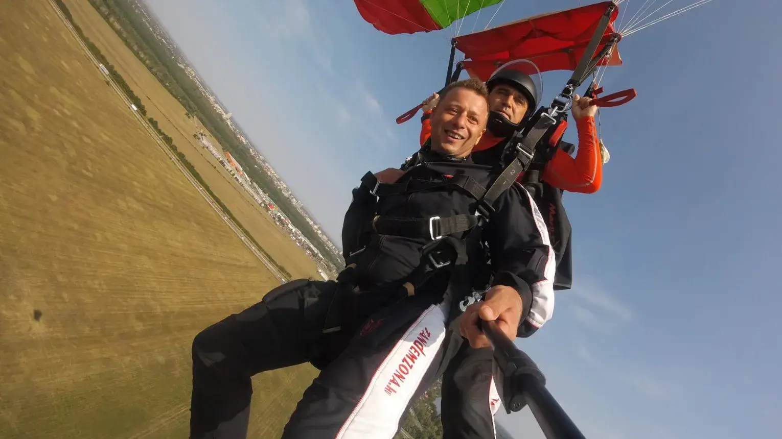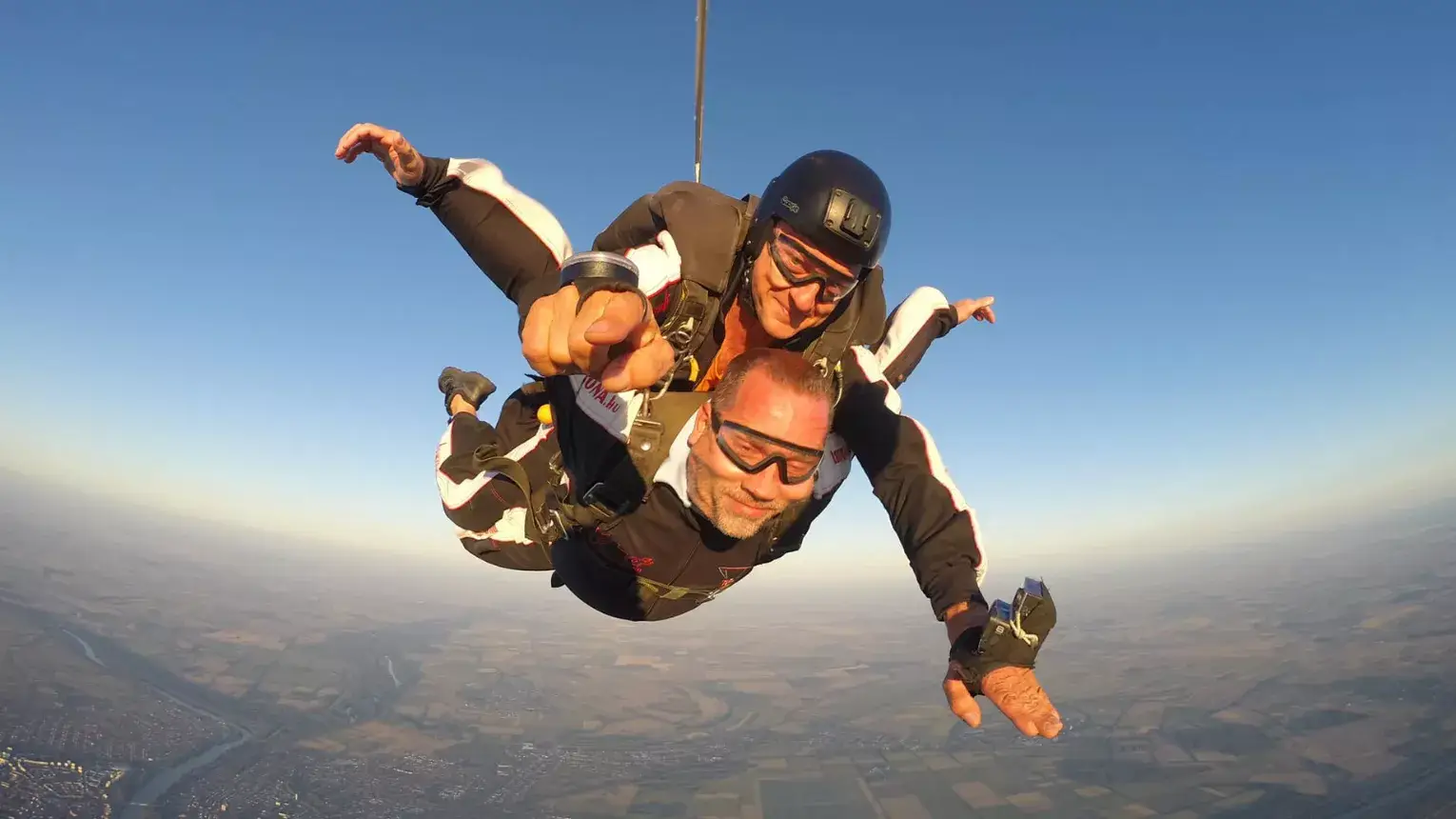1.500 m magasságban nyitom az ejtőernyőt, és szépen visszaváltunk normál sebességre. Az ejtőernyő fokozatosan nyílik ki, ezért nem fog nagyot rántani rajtunk. 6-8 másodperc alatt térünk vissza a fülsiketítő sebességből a csend világába. Most egy nagy, kétszemélyes ejtőernyő alatt lógsz magasan a föld felett. Az ernyő nyílása közben figyeld az operatőrt, ahogy tovább zuhan lefelé, hogy fogalmad legyen róla, milyen sebességed volt pillanatokkal ezelőtt!