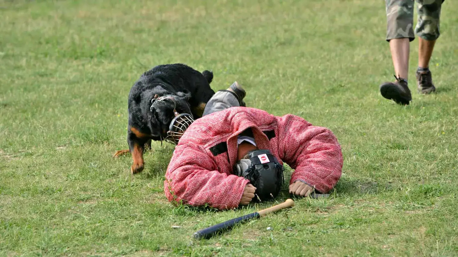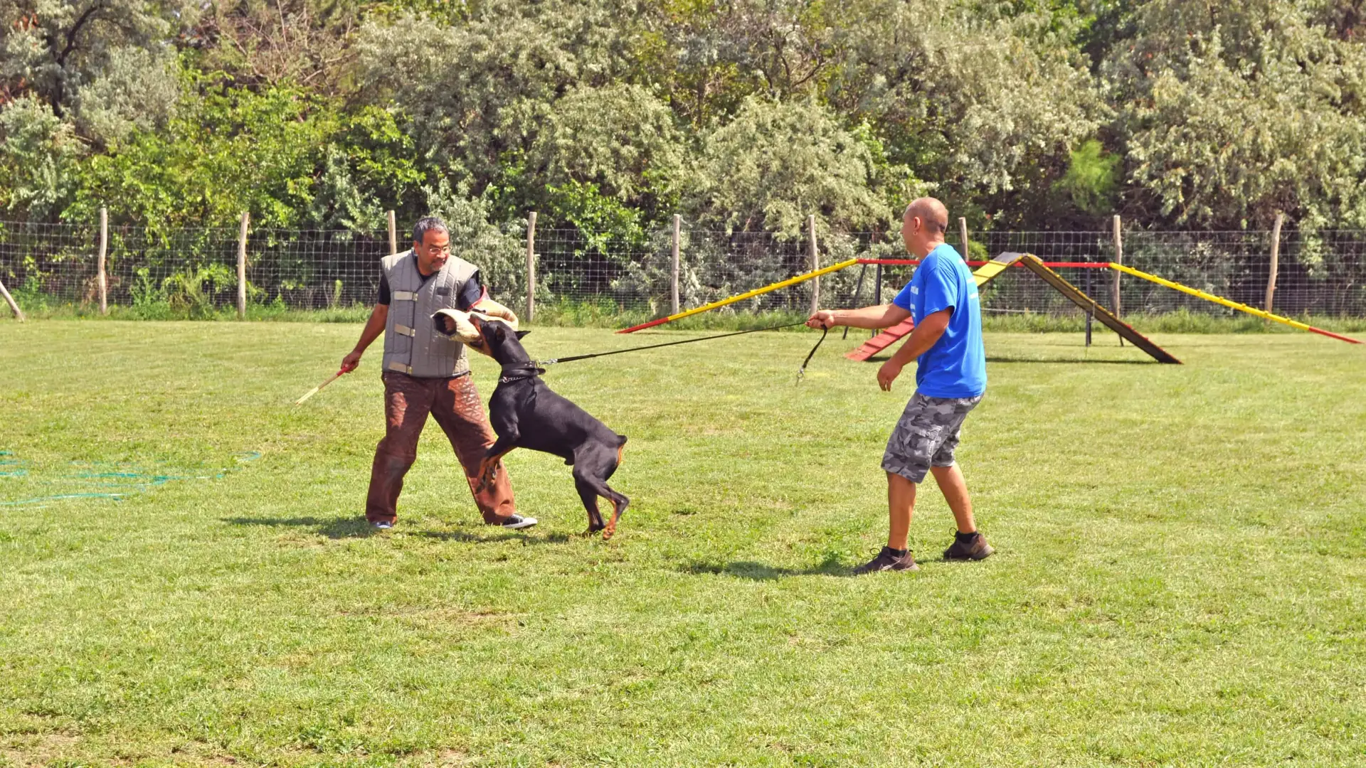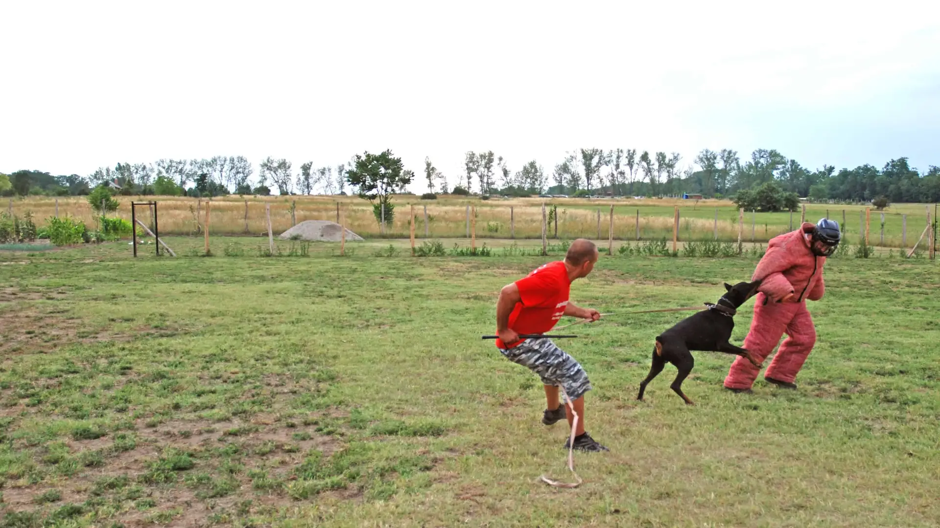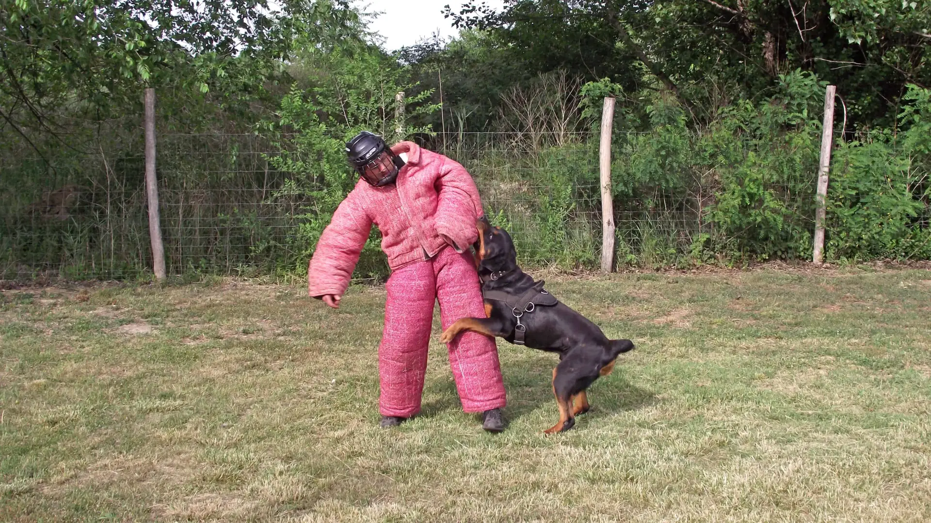 Szépen-fokozatosan hangolunk egymásra téged és a kutyát. Kezdetben még csak egyik karodra uszítjuk rá, miközben természetesen karvédőt viselsz. Utána jöhet, aminek jönnie kell: teljes öltözet, úgynevezett francia bunda és arcvédő sisak garantálja, hogy megúszd komolyabb sérülések nélkül, mikor rád engedjük a „vérebet".