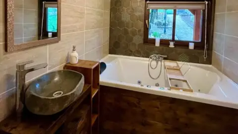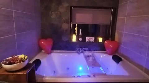 - fürdőszoba hegyekre panorámás 2 személyes fényterápiás jakuzzis káddal (2 db törölköző/fő biztosított)
