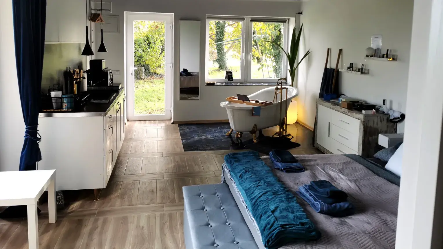 Teljesen felújított egykori présház, mely külsejével a régmúltat idézi, bent azonban a csillagok között érezheted magad. Térben álló kád kilátással a végtelenbe és tovább, holdlámpa, a teraszon pedig vár a buborék, hogy a kanapén ülve, vagy fekve, esőtől, széltől védve gyönyörködhess a tájban.