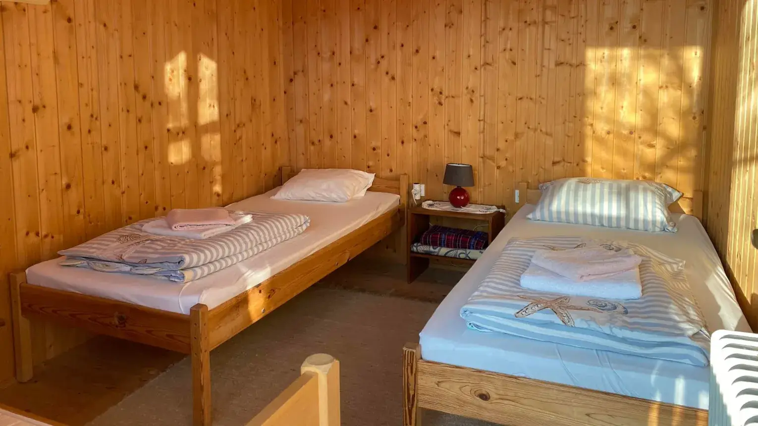 - 2 szoba (az emeleten 2x2 személy – egy dupla és két szimpla ágy + 1 gyerek ágy) + földszinten egy kihúzhatós kanapé 2 főre