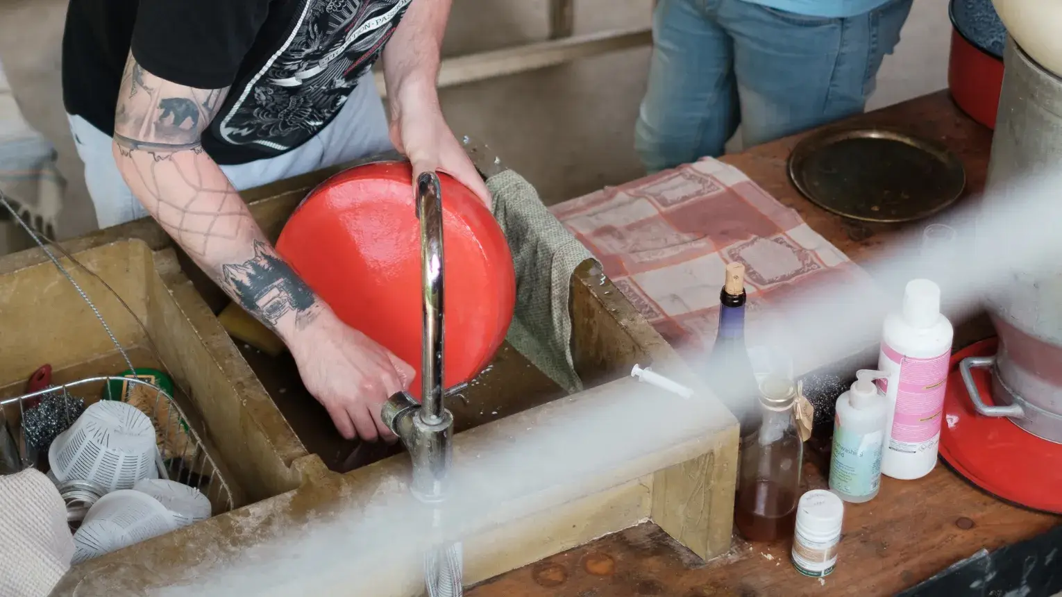Már az is egy élmény, ahogy 60 liter tejet beleöntünk a rézüstbe, ahol a kultúra baktériumok elkezdenek benne szaporodni. Megaltatjuk, vágjuk, keverjük - ez felér egy meditációval - majd az üst alján összegyűlt alvadélot a formába szedjük, kezdődik a préselési és forgatási rend.