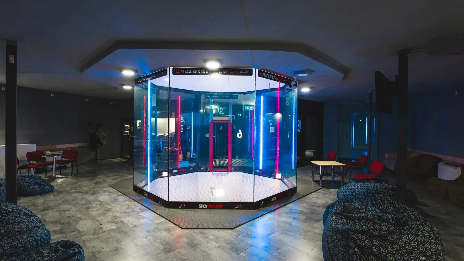 A szélcsatornában a tériszonyosoknak sem kell aggódniuk, hiszen a szélcsatornás lebegés alapesetben 1,5 és 3 méter között zajlik. A szélcsatornát egy speciális turbina üzemelteti, aminek a segítségével 180-200 km/h sebességgel süvít felfelé a levegő, ami pontosan azt az érzést kelti, mintha 3500 m-ről zuhannál ki! A szélcsatorna a bajnokok edzőterme, tökéletesen hozza azt a feelinget, amit a magasban élnek át a profi ejtőernyősök.