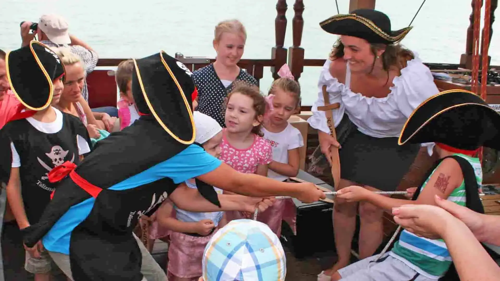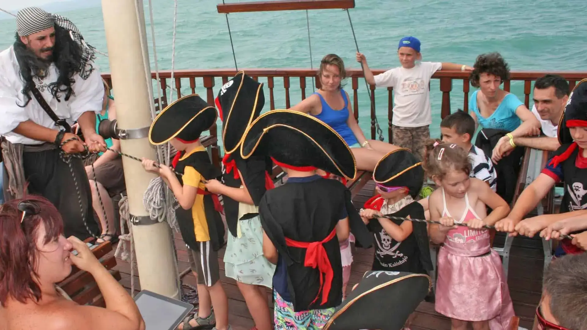 A hajóút során a jó hangulatot kalózkapitányunk biztosítja és a gyermekek az ő irányítása alatt próbálhatják ki magukat, mint tengerjáró kalózok.