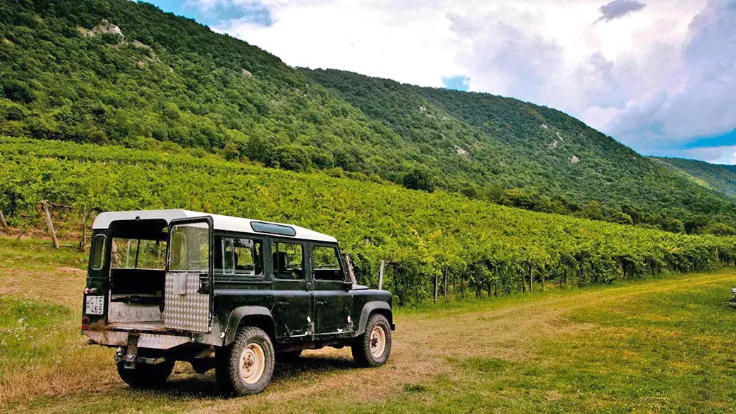 Terepjáró off-road túrával kezdünk! Irány fel a hegyoldalba, megmutatjuk hol is és hogyan terem az a szőlő, amiből ezek a finom borok készülnek.