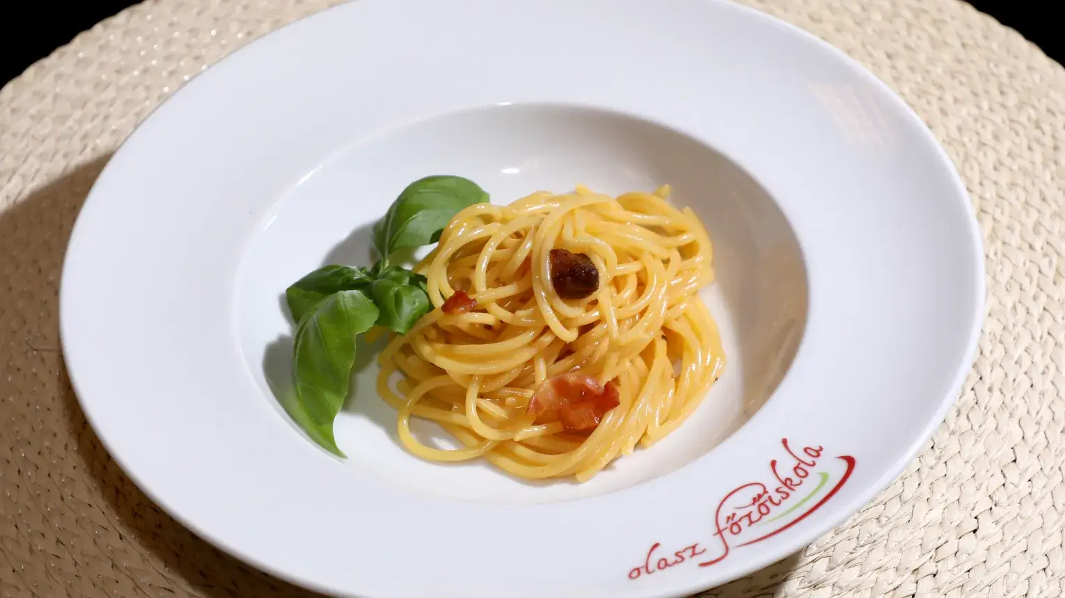 Spaghetti szénégető módra, vagyis sült császárszalonna darabokkal, tojással, parmezán sajttal tálalva