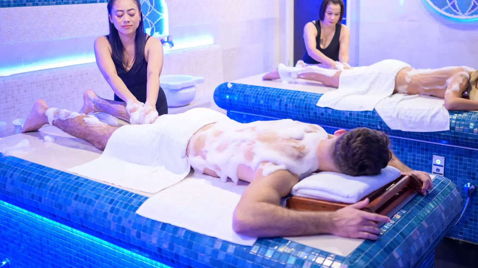 A bőrradírozást követően egy habos masszázsban lehet részünk, amely segít a bőr mélyebb hidratálásában és a test ellazításában. Az elején még szintén peeling kesztyűben, utána pedig a habosítás és lemosás váltakozik, lágy masszázsra hajazó mozdulatokkal.