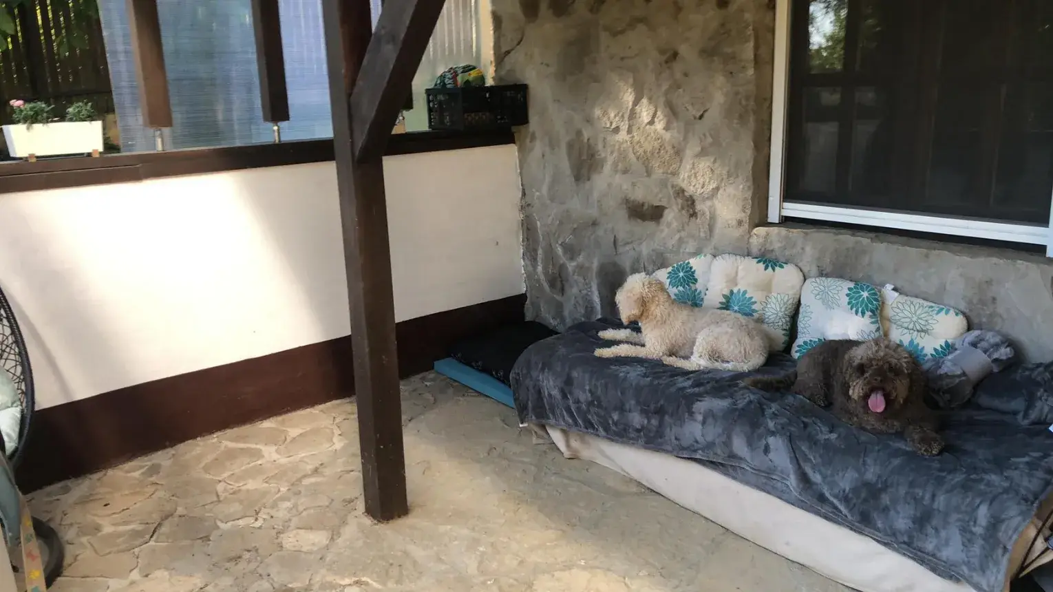 Bent kennelek, kutyaágyak kanapék, benti logikai játékok, rágó játékok, kutya tv ( speciális műsorokkal, melyet kutatók állítottak össze megfelelő hang-kép kísérettel, mely a pihenést v. figyelemfelkeltést, szocializációt szolgálja) szolgálják az időtöltést. 25 m2 fedett burkolt felület áll rendelkezésre eső esetén is, mely közvetlenül összenyitható a belső térrel.