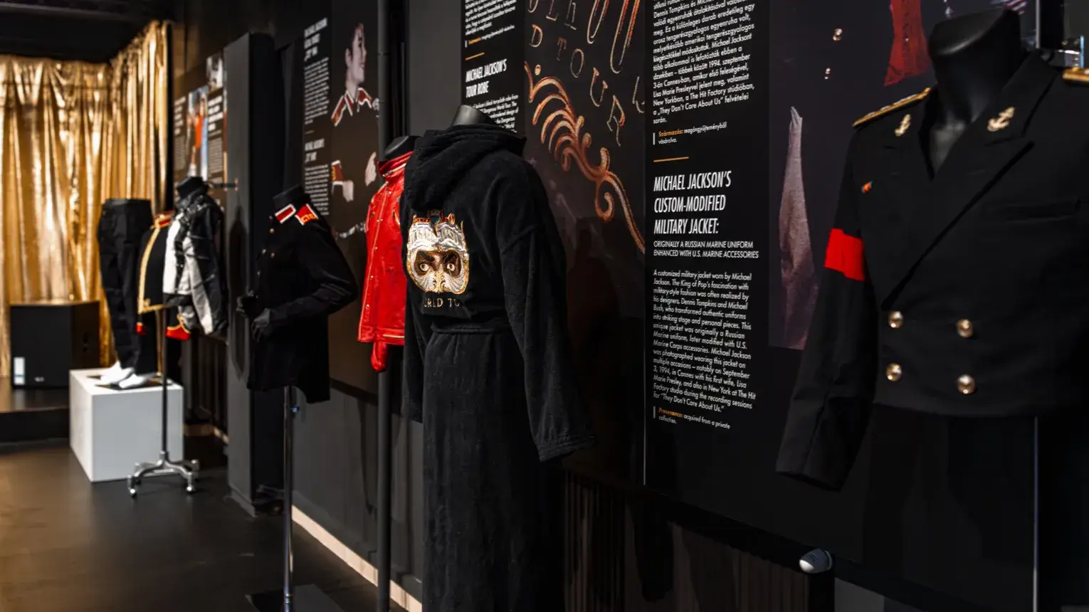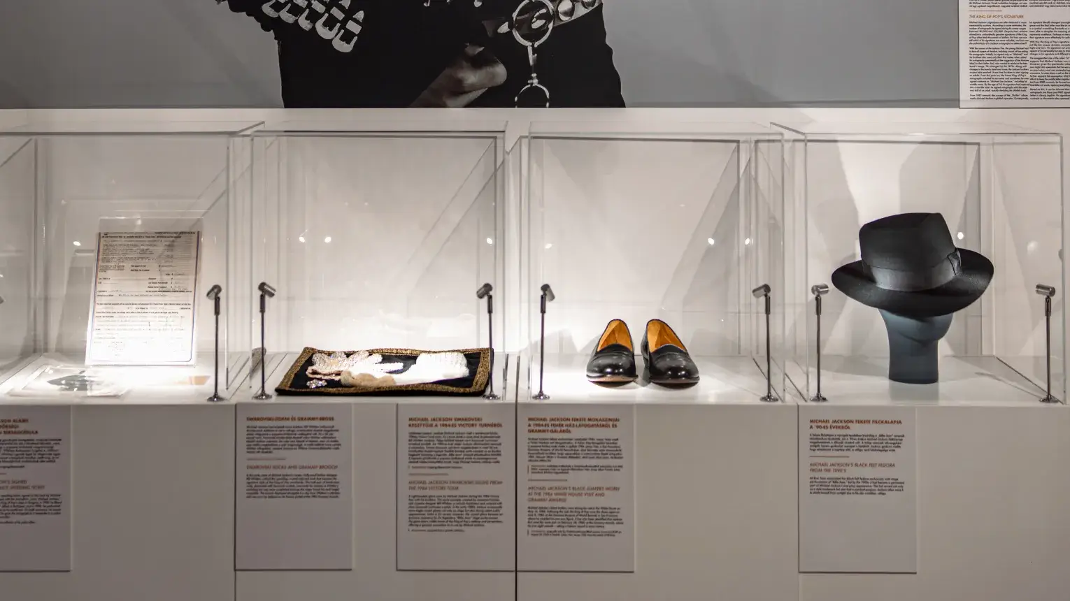 - Ikonikus relikviák: eredeti színpadi jelmezek, filmes kellékek, a strasszos kesztyű, kéziratok, díjak, arany- és platinalemezek.