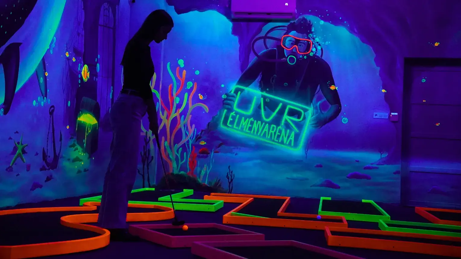 A 13 lyukú minigolf pálya nemcsak izgalmas kihívásokat tartogat, hanem lenyűgöző vizuális élményt is nyújt: a UV-fényekben úszó, víz alatti tematikájú környezet minden egyes ütést különlegessé tesz.