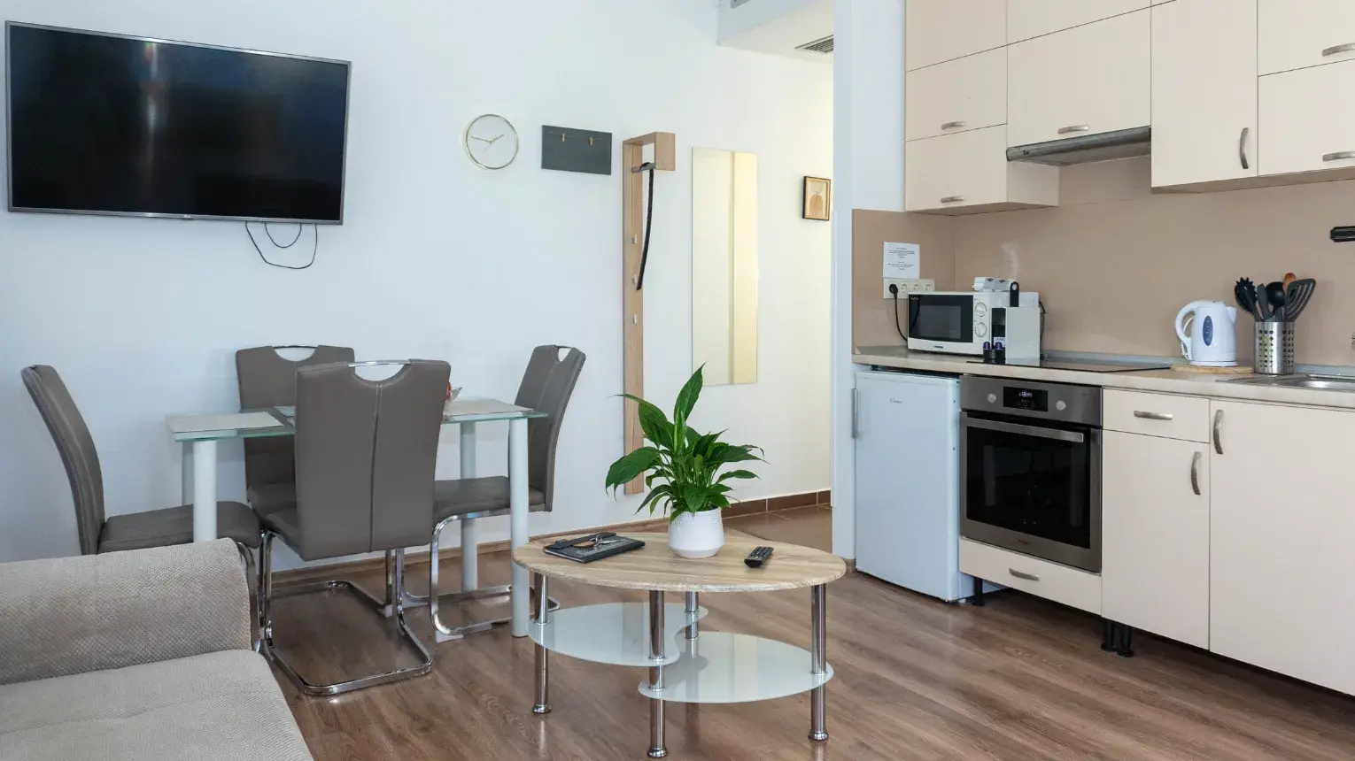 amerikai konyha-nappali berendezésű, melyben minden konyhai eszköz megtalálható (elektromos főzőlap, sütő, vízforraló, mikrohullámú sütő, kenyérpirító, fagyasztós hűtő, kapszulás kávéfőző).