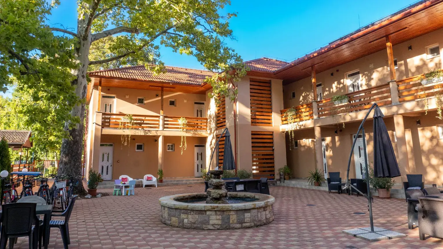 A zárt udvaron lévő filagória ideális helyszínt biztosít egy délutáni hűsöléshez a szökőkút mellett, a fák árnyékában. Az udvaron grill, főzősarok, babzsákok, kerti ülőalkalmatosságok garantálják a kényelmet. A vendéglátók különböző szabadtéri játékokkal kedveskedtek a kisebb-nagyobb látogatóknak: darts, ping-pong asztal, tollas, társas- és kártyajátékok, valamint a szálláson kerékpárok kölcsönözhetők., de a kamerával megfigyelt udvaron saját bringáját is nyugodtan tárolhatja az Ajándékozottad. Az apartmanok és az udvar kialakítása során a tulajdonosok arra törekedtek, hogy minden igényt kiszolgáljanak; igyekeznek folyamatosan fejleszteni, új eszközöket beszerezni, hogy minden Vendégnek emlékezetes legyen az itt töltött idő!