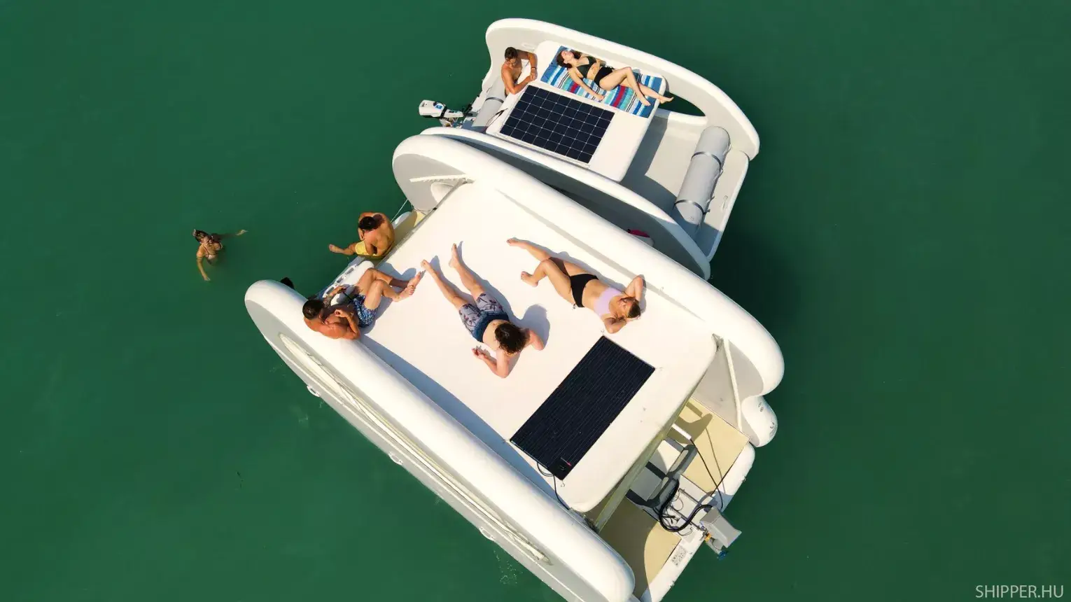Egy igazi, elektromos katamarán lehet a tiéd és barátaidé. Hajós jogosítvány nélkül vezethető, hat/nyolc fővel is használható és a napozó tetőn kettő/négy fő tud egy időben napozni! Elektromos meghajtása akár 40 km megtételére is lehetőséget ad egyetlen felöltéssel, így a Balatont bátran felfedezhető családdal, barátatokkal. A tetején elhelyezett napelem pedig tovább növeli a ható távot és nem utolsó sorban megújuló energiából, környezet tudatos módon értékelhető a Balaton szépsége! Mindenki számára élvezhetővé válik a gyönyörű panoráma nem csupán főszezonban, a tikkasztó 35 fokos hőségben, hanem akár már a tavaszi, kora őszi napsütésben is!