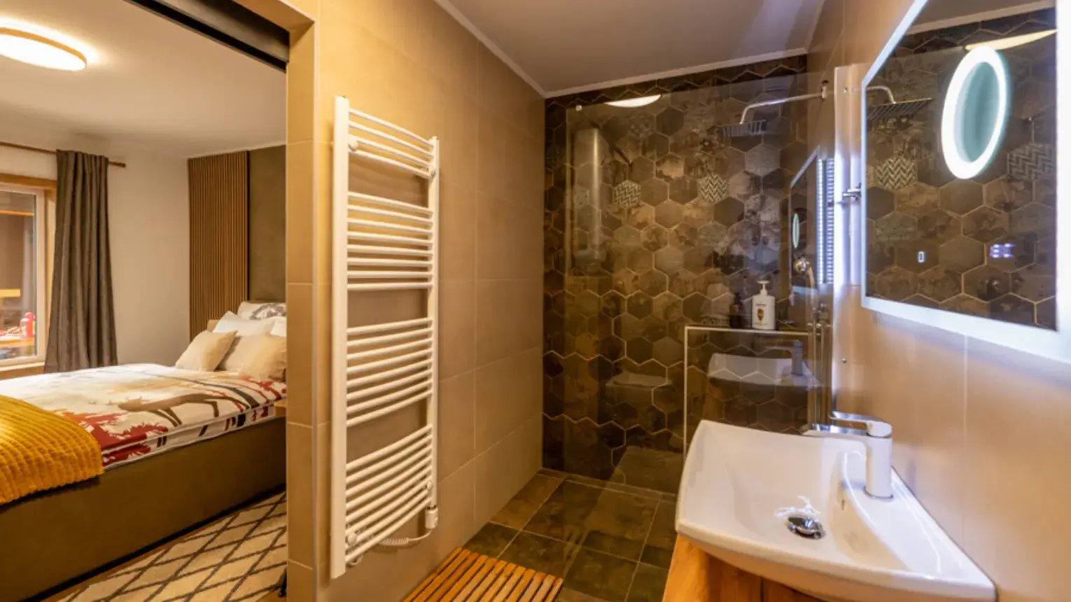 Nagyméretű, 2 személyes zuhanykabin kapott helyet. Érintő paneles LED tükröt, hajszárítót, sampont, tusfürdőt és törölközőt is találtok, semmit sem kell hoznotok.