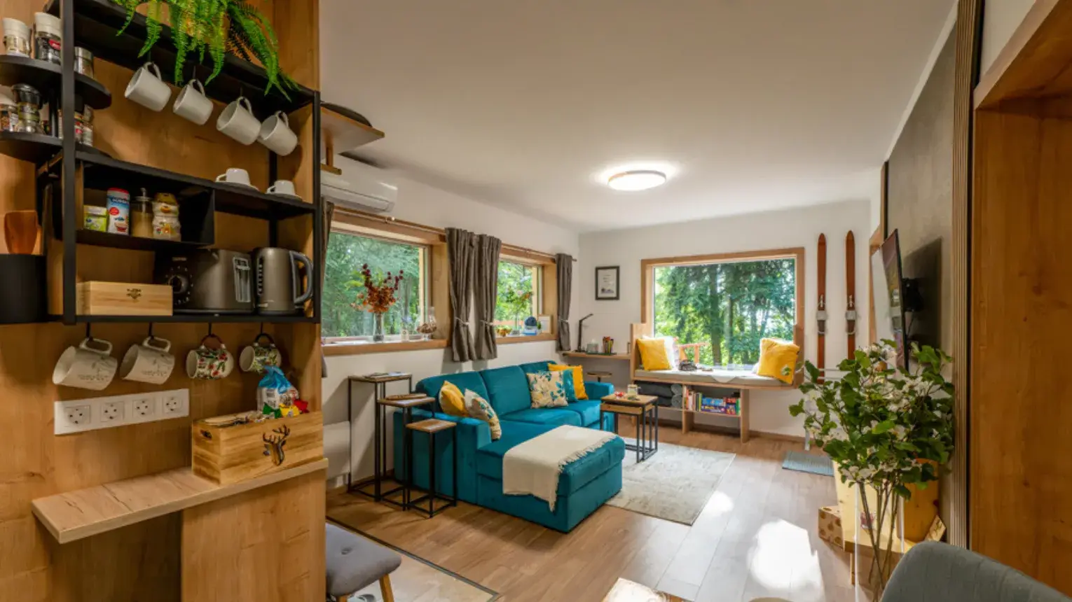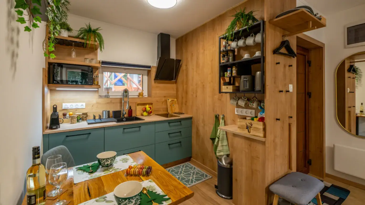 A konyhában mindent megtalálsz, amire szükséged van. Tányér és evőeszköz készlet, pohárkészlet különböző méretekben és funkciókban, minőségi késkészlet, vágódeszka készlet, edénykészlet a legfontosabb dolgokhoz. Főzéshez 2 zónás indukciós főzőlap használható, ezen kívül hűtőszekrényt is találsz mélyhűtő résszel.