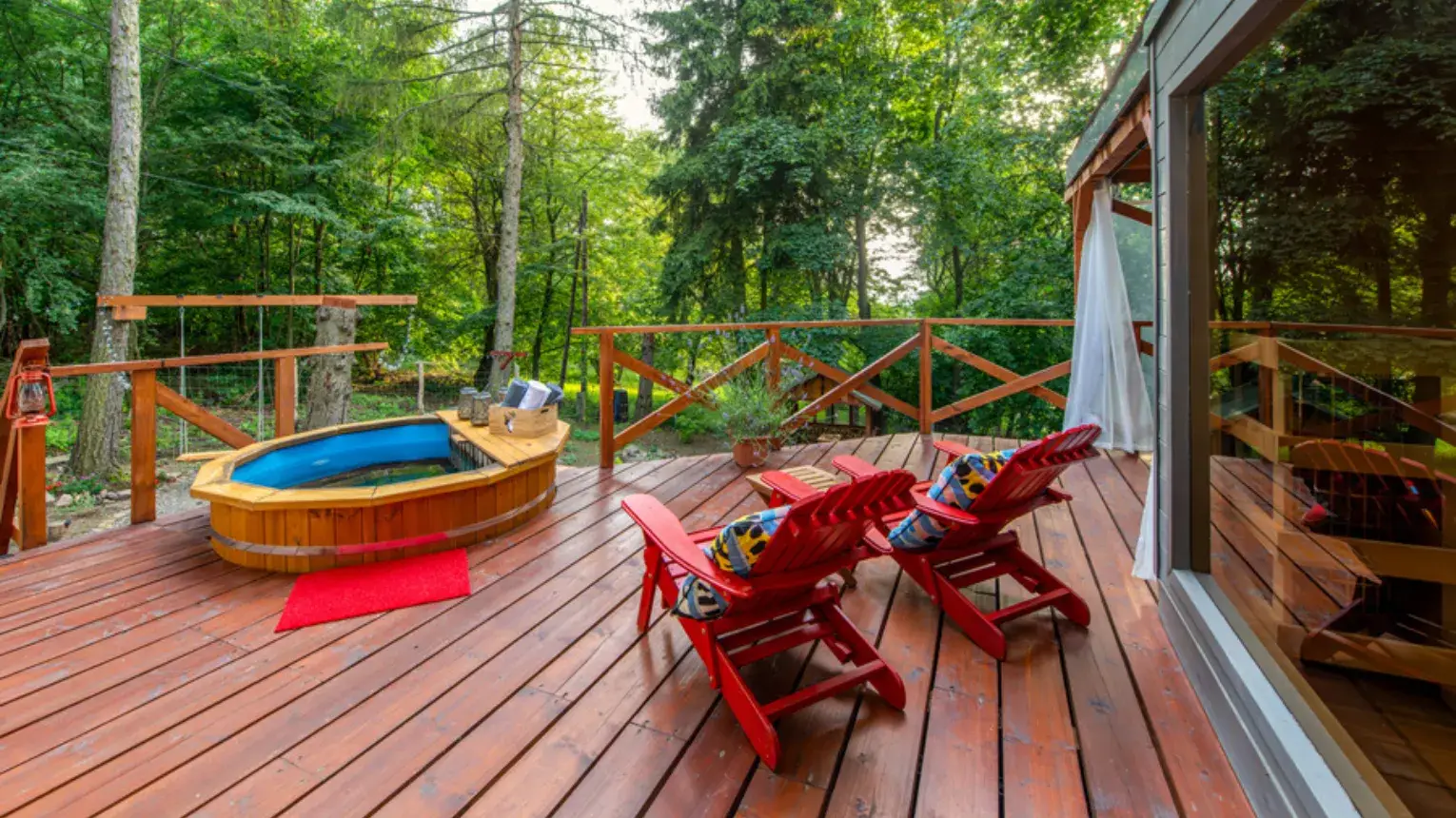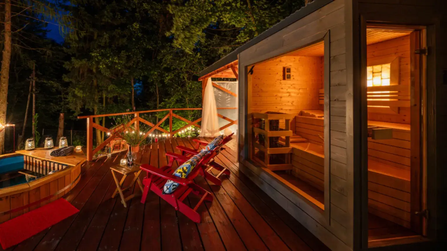 A nappaliból a természetre nyílik egy óriási terasz ahol egy szabad ég alatti wellness részt alakítottunk ki. A finn panorámaszaunát és a teraszba süllyesztett dézsát igény szerint térítésmentesen használhatjátok.