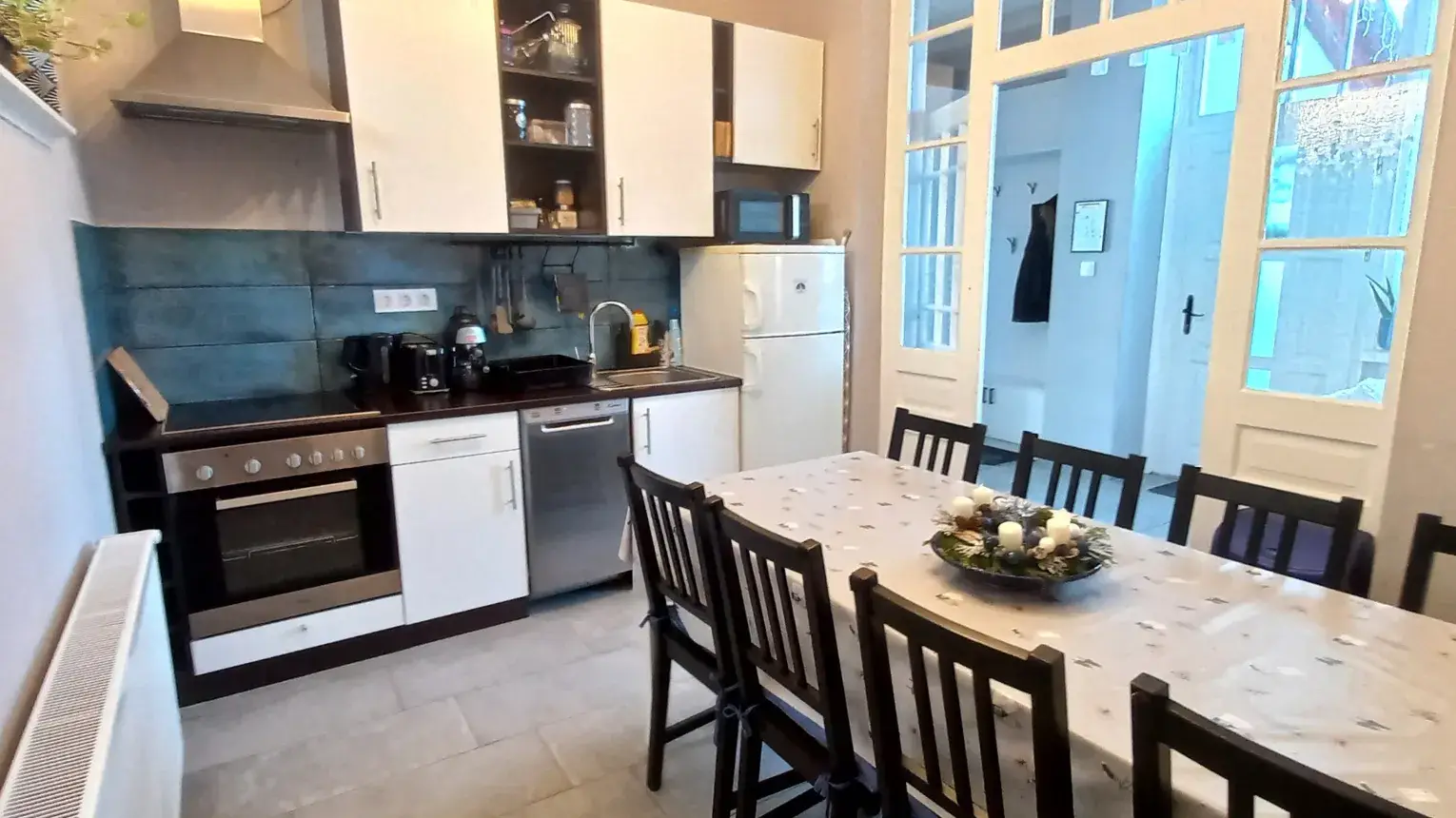 - Teljesen felszerelt konyha, 9 fős étkezővel (sütő, főzőlap, hűtő mélyhűtővel, mikro, mosogatógép, kenyérpirító, kávéfőző, vízforraló, teljes edényzet, kávé és tea bekészítés)
