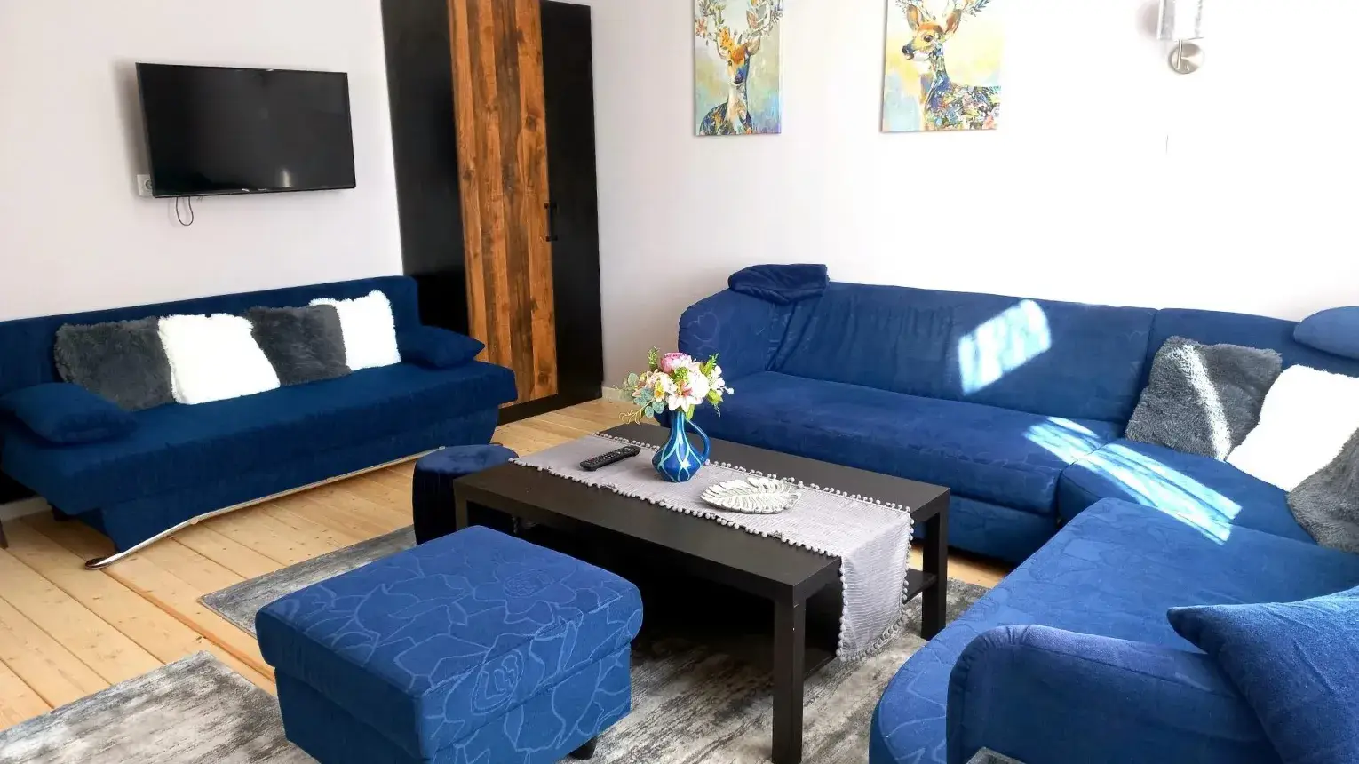 - Nappali 2 főre nyitható kanapéval, 106 cm-es smart tv-vel