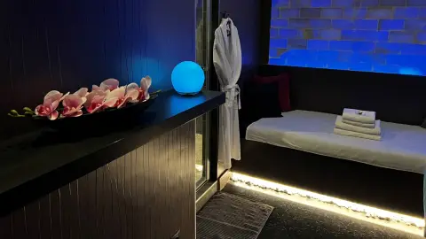 Spa felszereltsége: pihenősarok himalája sófal alatt, Hotspring masszázsmedence, tradicionális finn szauna és masszázs zuhanykabin. - Exkluzív Rituals pipere termékek, sampon, tusfürdő, testápoló