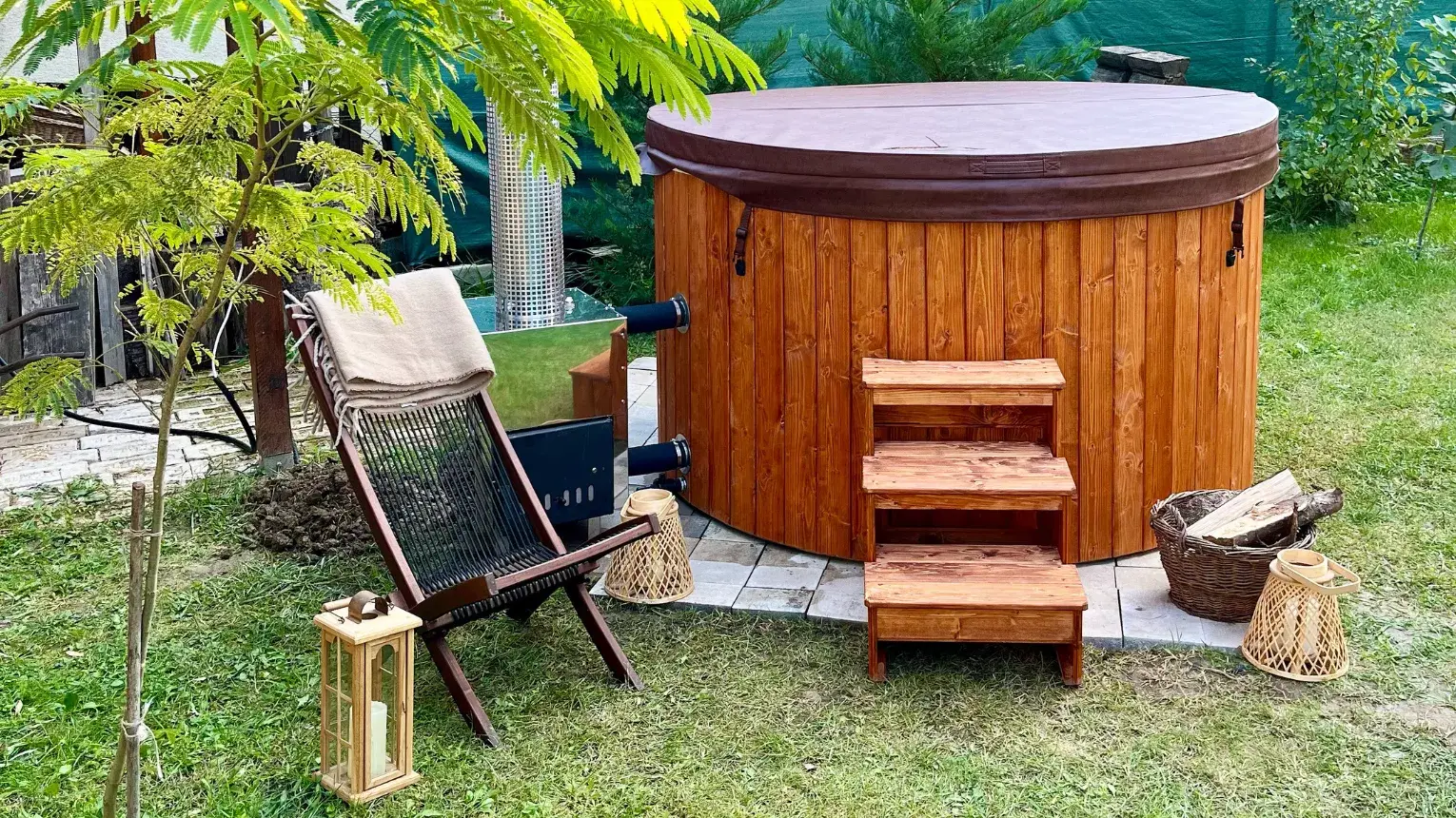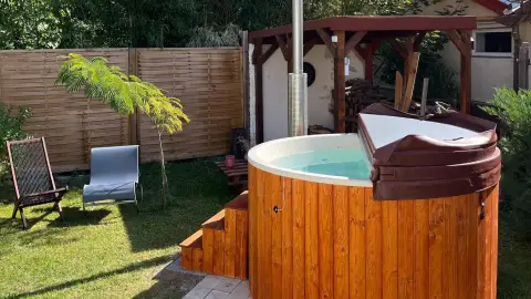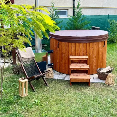 A kertben egy 6 fős fürdődézsa áll a vendégeink rendelkezésére, amely elektromosan és fával is egyaránt fűthető. Választásunk azért esett a meghitt hangulatú dézsára, mert gazdag fa anyagának köszönetően növeli a természetközeli élményt, melyet megtapasztalhattok nálunk a gyönyörű zöld környezetnek köszönhetően. Tűzifát természetesen biztosítunk korlátlanul.