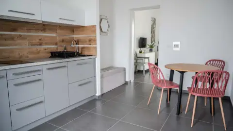 - Főzőlappal, hűtővel és mikróval felszerelt konyha