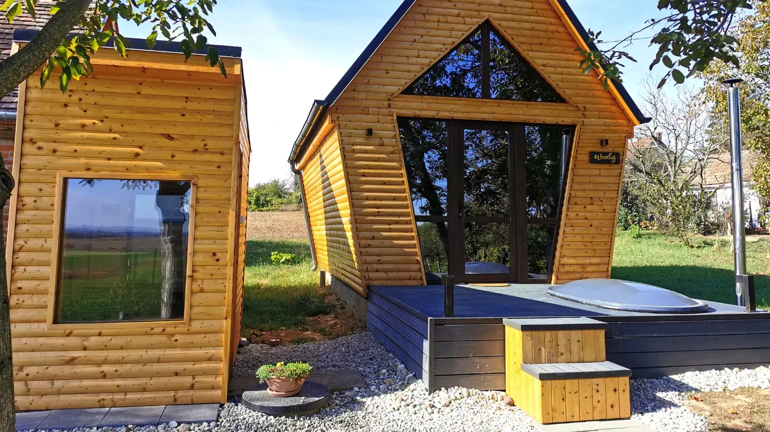 Egyedi és prémium minőségű két férőhelyes faház pazar kilátással, teraszba süllyesztett fűtött fürdődézsával és kültéri panoráma szaunával.