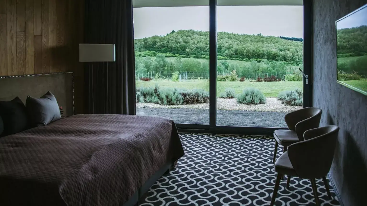 Minden szobánkból, köszönhetően a hatalmas üvegablakoknak, csodálatos panoráma nyílik a szőlőre, a Lajvér patak völgyére és a szemközti dombokra. A tágas 39 nm2 méretű, elegáns fürdőszobával ellátott szobákat úgy alakítottuk ki, hogy a lehető leginkább szolgálják a hozzánk látogatók kényelmét, minden adott legyen a kikapcsolódáshoz, pont úgy, mint egy 5 csillagos hotelben. A csodálatos természeti környezet és a modern, minimalista stílusú szobák kontrasztja tökéletes. A felhasznált anyagok, a berendezés minősége a legmagasabb sztenderdek szerint készült, miközben nagy hangsúlyt fektettünk a természetes anyagok használatára. Üveg, fa, kő, beton és finom textilek, a gondosan megkomponált színek és az igényes világítás olyan apró részletek, amelyek szerintünk nagyon sokat számítanak.