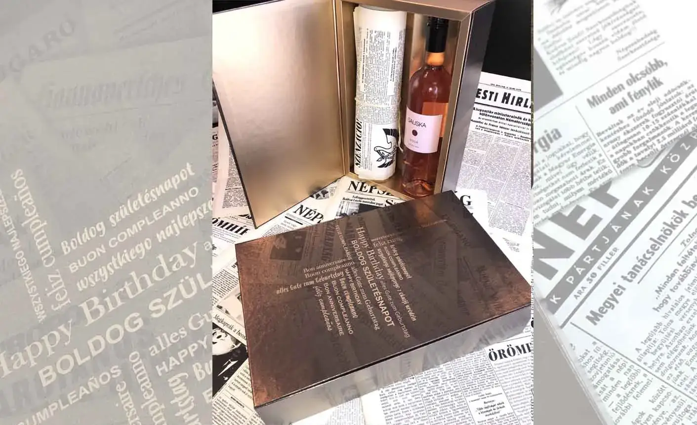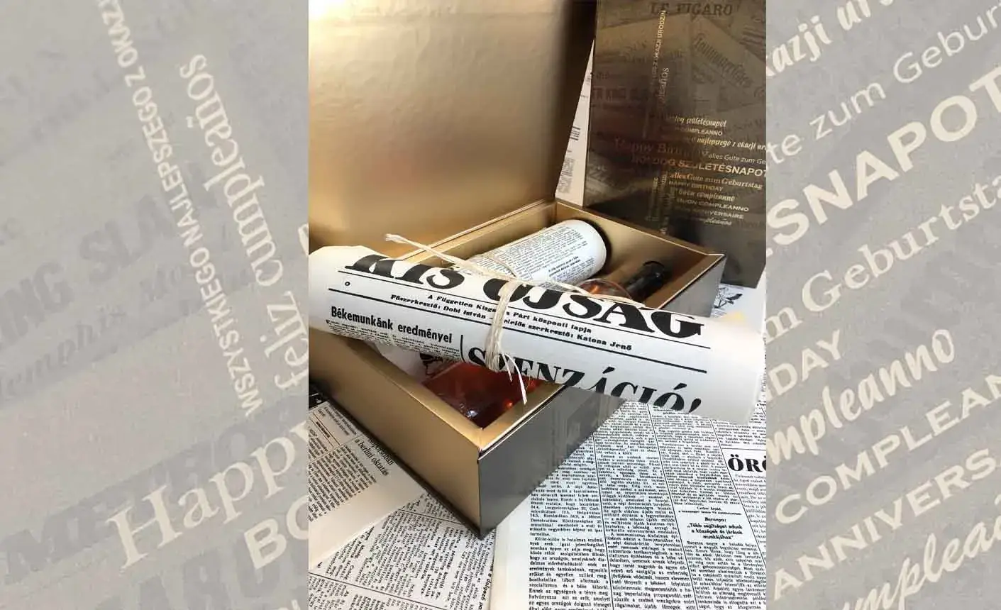 KapcsolatfelvételSzületésnapi újság aranyozott díszdobozban ajándék üveg BORRAL