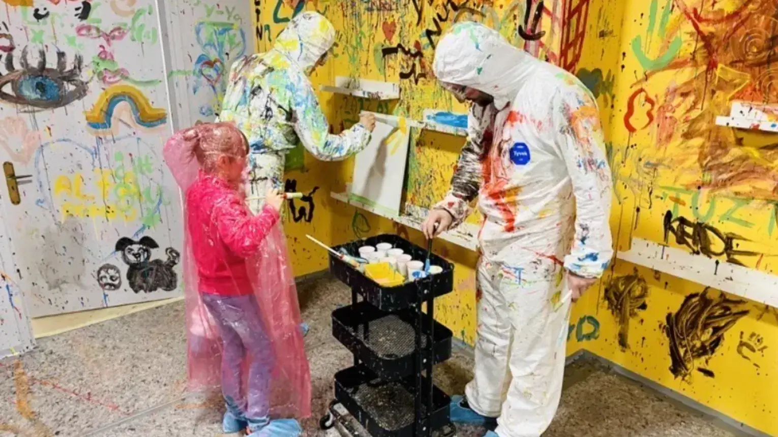 A Fröcskölőbe mehet 3 éves gyerkőc is, voltak már kisebbek is és nagyon élvezték a programot 😊 Van nekik is védő ruha, gyerekeknek esőponcsó, felnőtteknek pedig védőoverál van biztosítva. Vizes tempera amivel festenek, alkotnak, fröcskölnek, ezt használják a bölcsiben, oviban és iskolában is, ha a szájába kerülne a kicsinek, nem lesz baja 😊