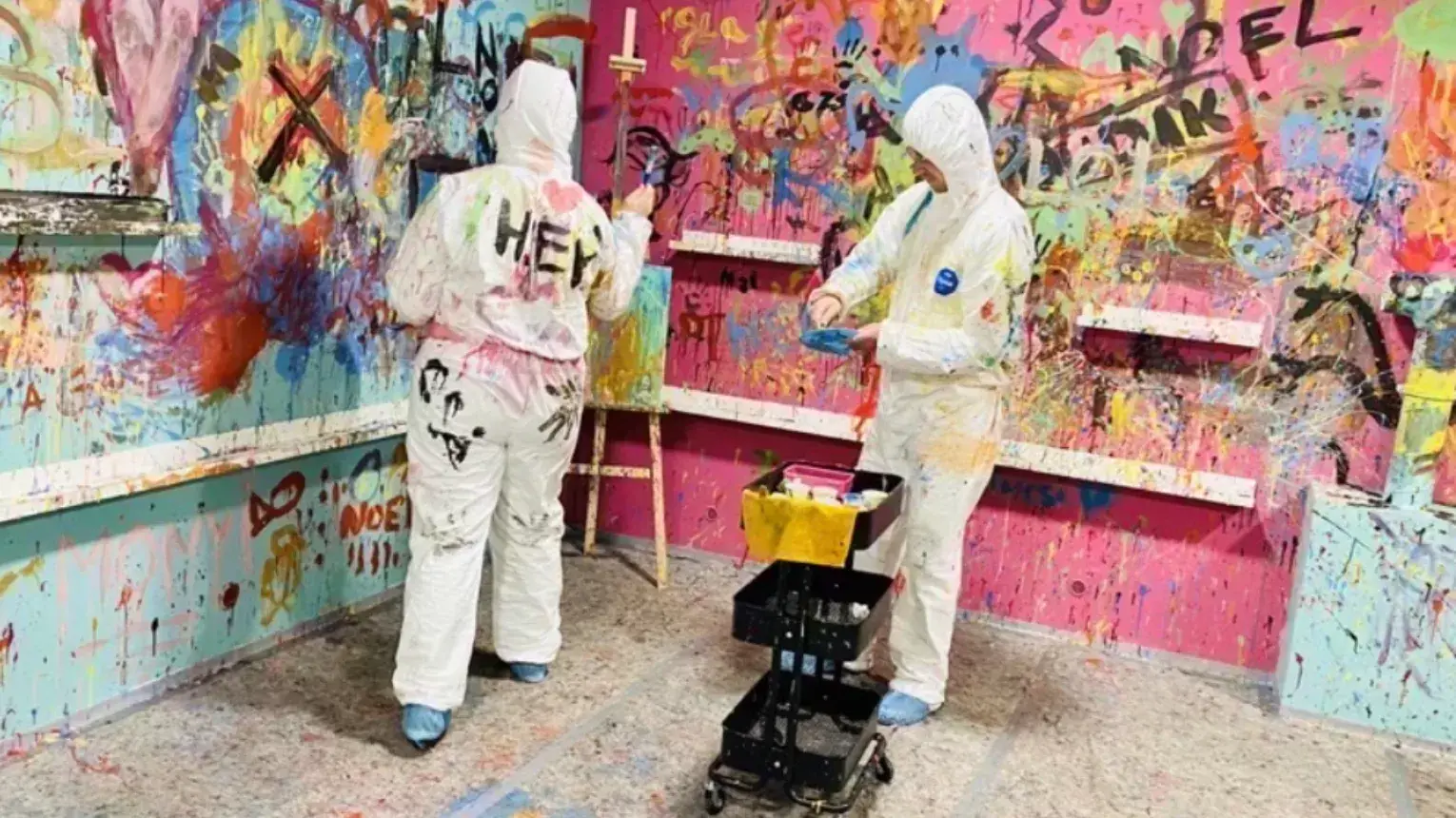 Biztosítjuk számotokra a védőfelszereléseket (szemüveg, cipővédő, esőponcsó, kérésre védőoverál), az ecseteket, a vásznakat és a festékeket is (bőrbarát, vizes bázisú tempera). Nektek csak jönnöd kell és élvezni a felfordulást!