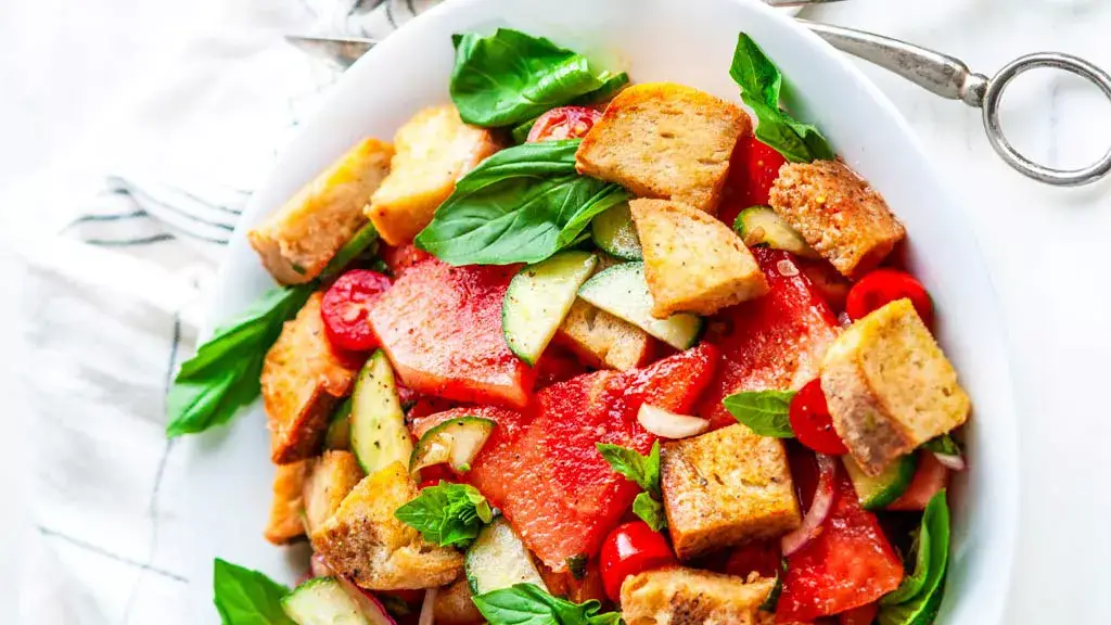 - Panzanella saláta olívabogyóval – friss, toszkán kenyérsaláta zamatos paradicsommal, ropogós zöldségekkel, extra szűz olívaolajjal és mediterrán fűszerekkel. Könnyed, de laktató előétel, a nyár esszenciája egy tányérban.