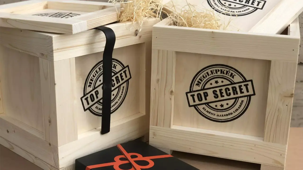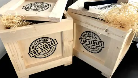 Ez egy természetes fából készült láda. Az ajándékláda Top Secret (szigorúan titkos) felirattal van ellátva. Az ajándékládához kap egy acél feszítővasat és szögeket is. Ezután saját maga rakhatja össze az ajándékládát.