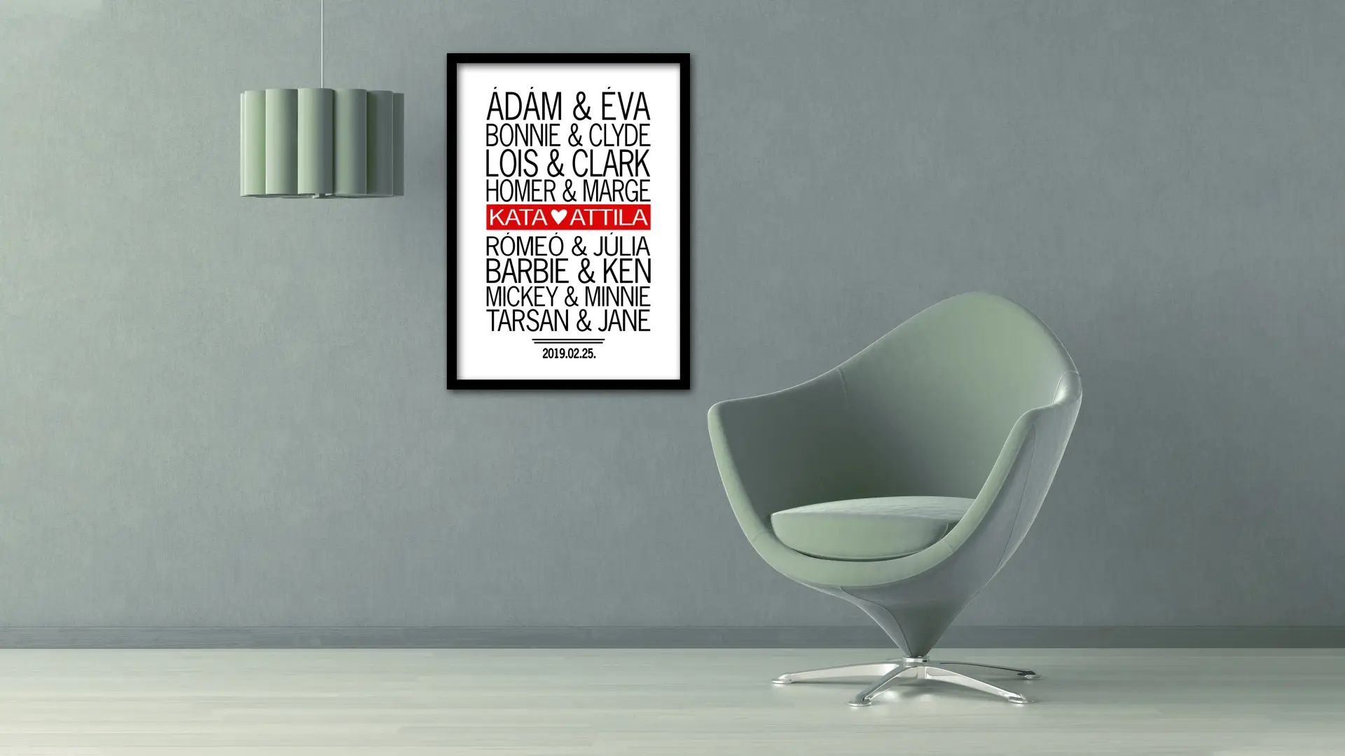 A Szerelmes nevek posztert kérheted fekete és fehér alapszínben is tetszésed szerint! A mérete A2-es és keretben kinyomtatva vagy pedig habkartonra nyomtatva adjuk át, vagy postázzuk neked!