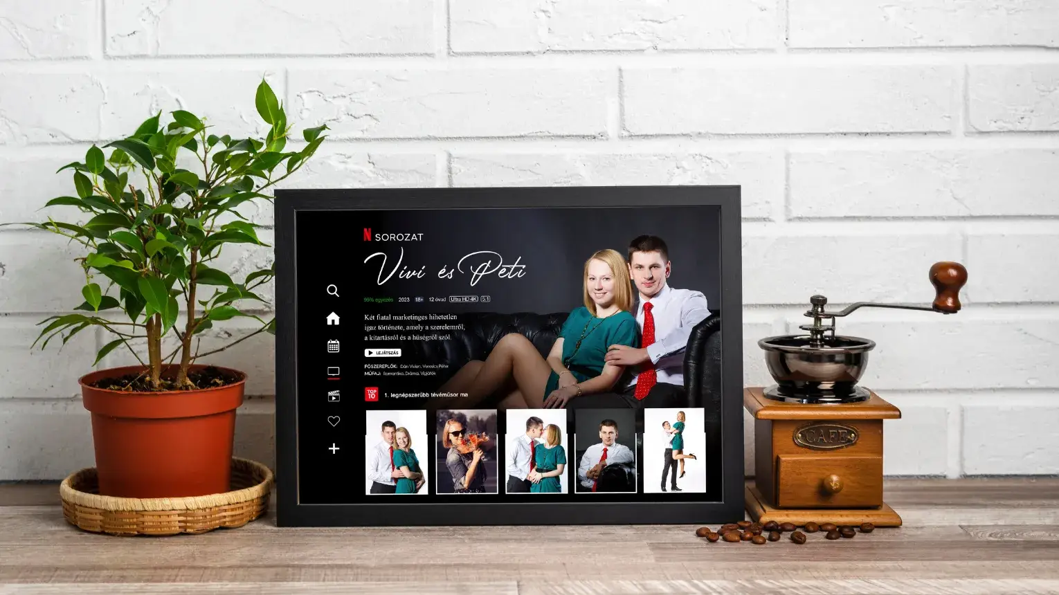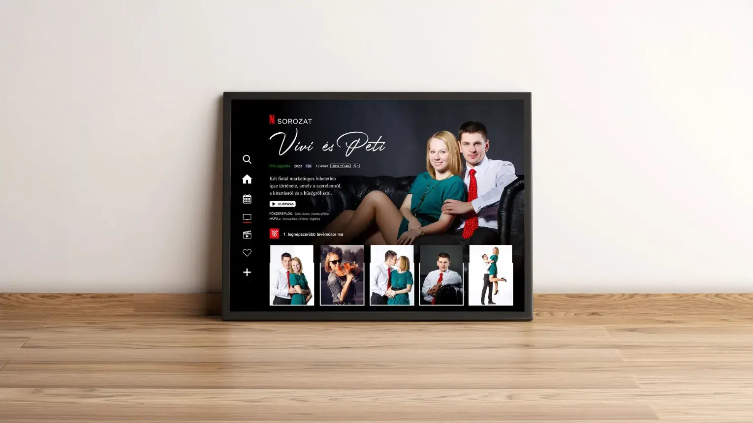 Ez az egyedi sorozatos összeállítás ötvözi a közös sorozatnézések emlékeit és az együtt töltött romantikus pillanatokat. Emlékezetes és érzelmes élményeket idézz vissza, egyedi fotósorozat összeállításban. A sorozatos ajándék képen a ti fotóitok, neveitek és a történetetek szerepel.