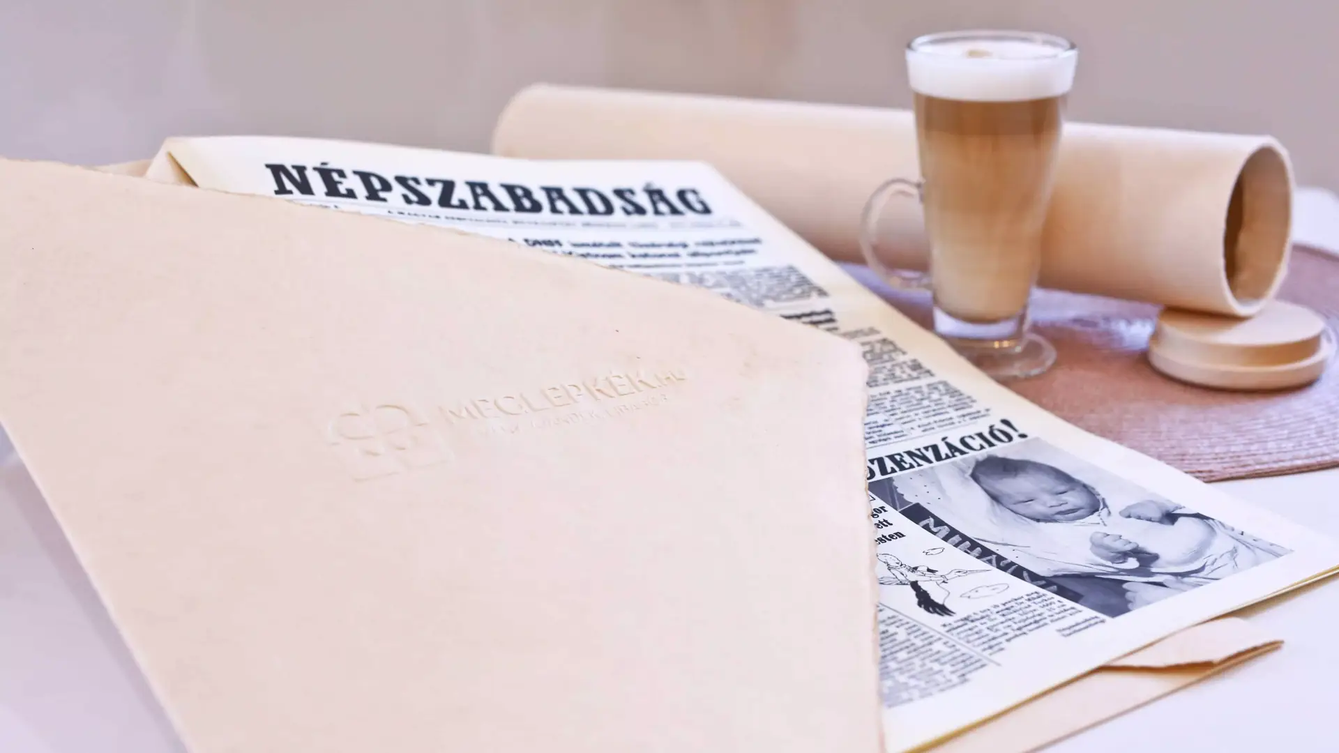 A Szülinapi Újsághoz adunk egy szép, igényes merített papírból készült mappát melybe kényelmesen, hajtás vagy tekercselés nélkül elhelyezhető az ajándék.