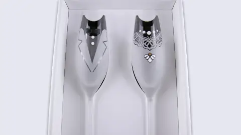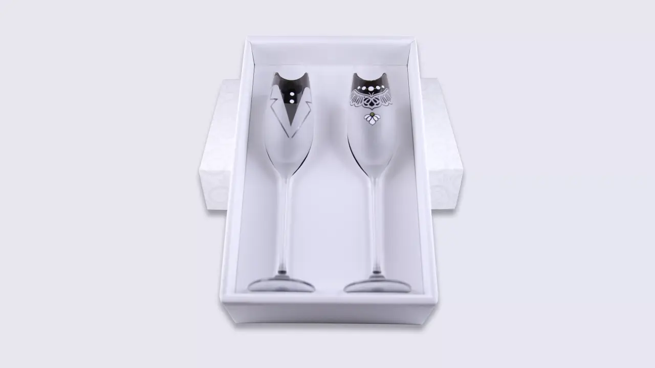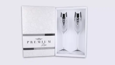 A design pezsgőspoharak magassága 26 cm. A képen látható díszdobozba csomagoljuk.