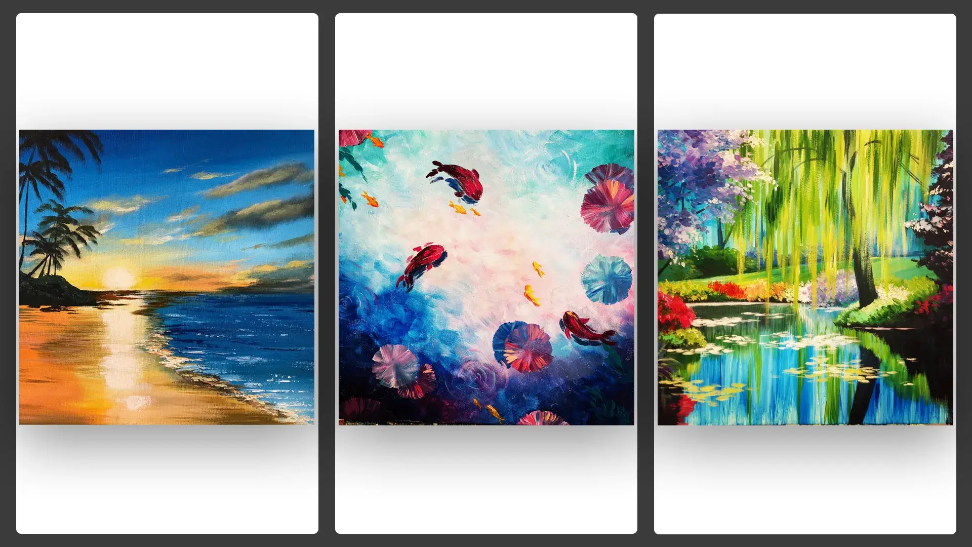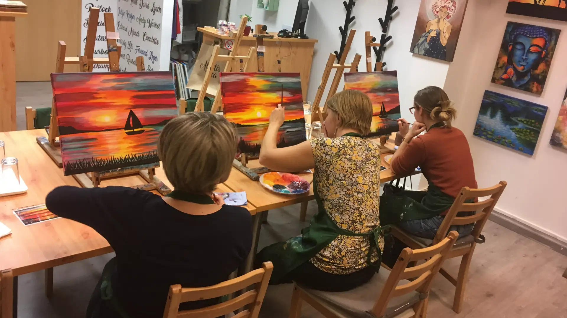 Ajánlottan 10 éves kortól már jöhetnek a kisebbek is felnőtt festéseinkre, amennyiben a 3 órás foglalkozás végig koncentrálása nem okoz nekik problémát. Számukra a „könnyű" képeink a legélvezhetőbbek és legjobban elkészíthetők.