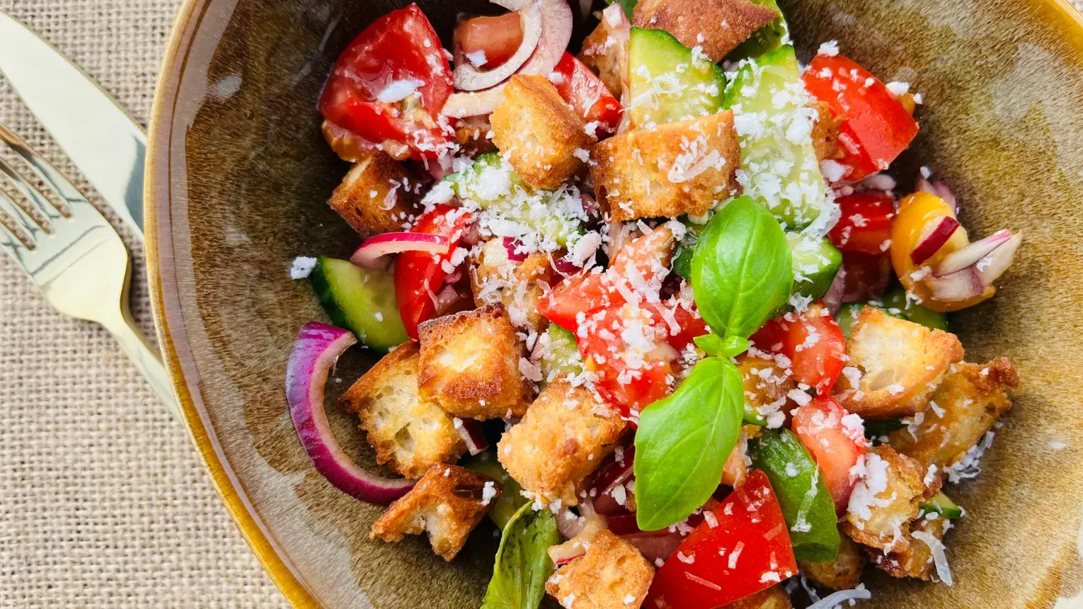 - Panzanella saláta olívabogyóval – friss, toszkán kenyérsaláta zamatos paradicsommal, ropogós zöldségekkel, extra szűz olívaolajjal és mediterrán fűszerekkel. Könnyed, de laktató előétel, a nyár esszenciája egy tányérban.